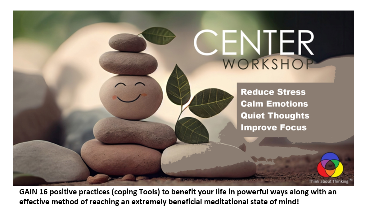 The CENTER TaT workshop supplies many proven Positive Practices to better handle life. When used together, they strengthen the ability to CENTER or rather, reach a resting space of physical, emotional and thinking calmness for obtaining more mental clarity. This is especially helpful for those that are challenged with attention issues. Be sure to have a comfy cushion, pen and paper and candle to light (if you want) when you attend.